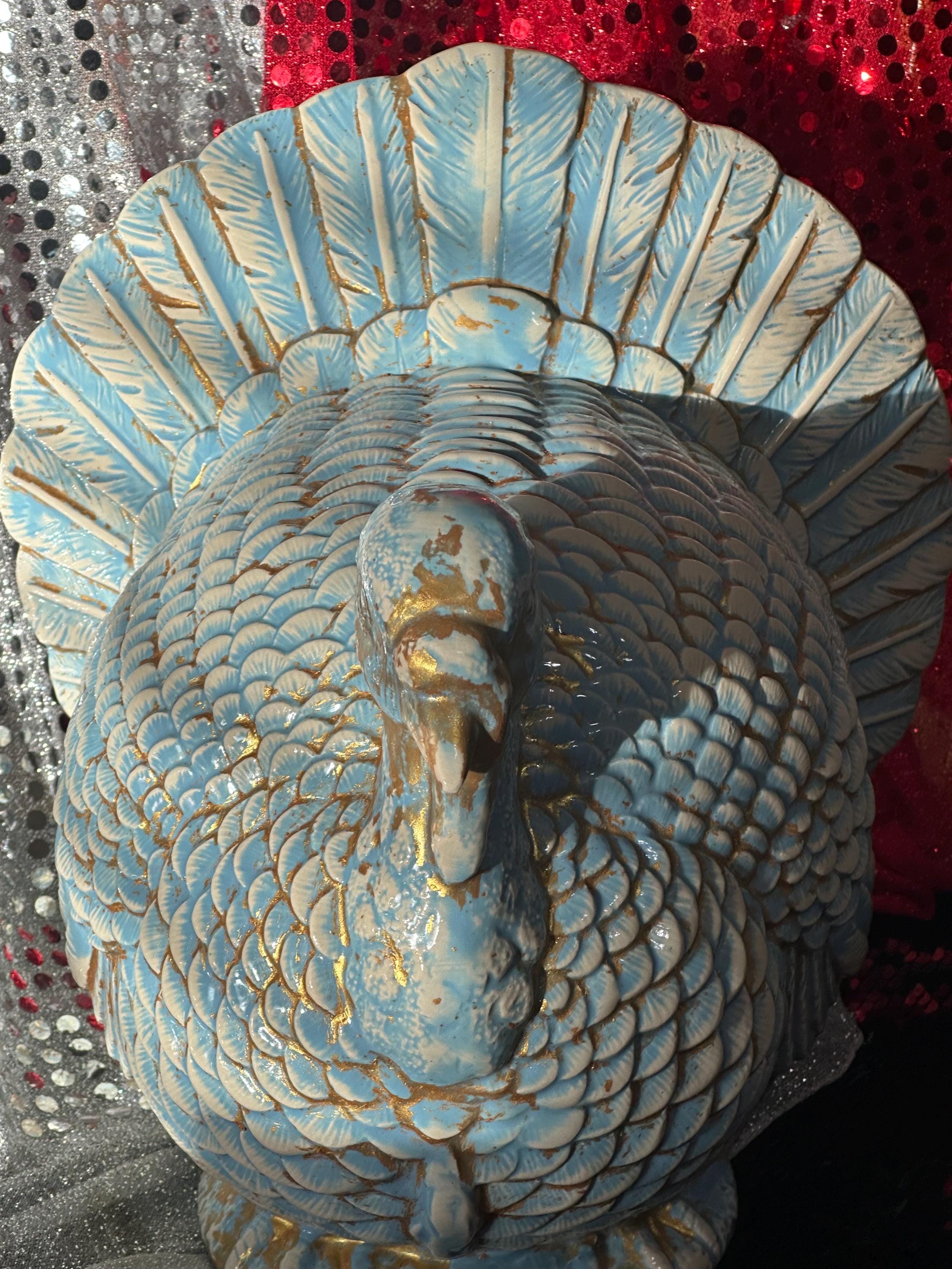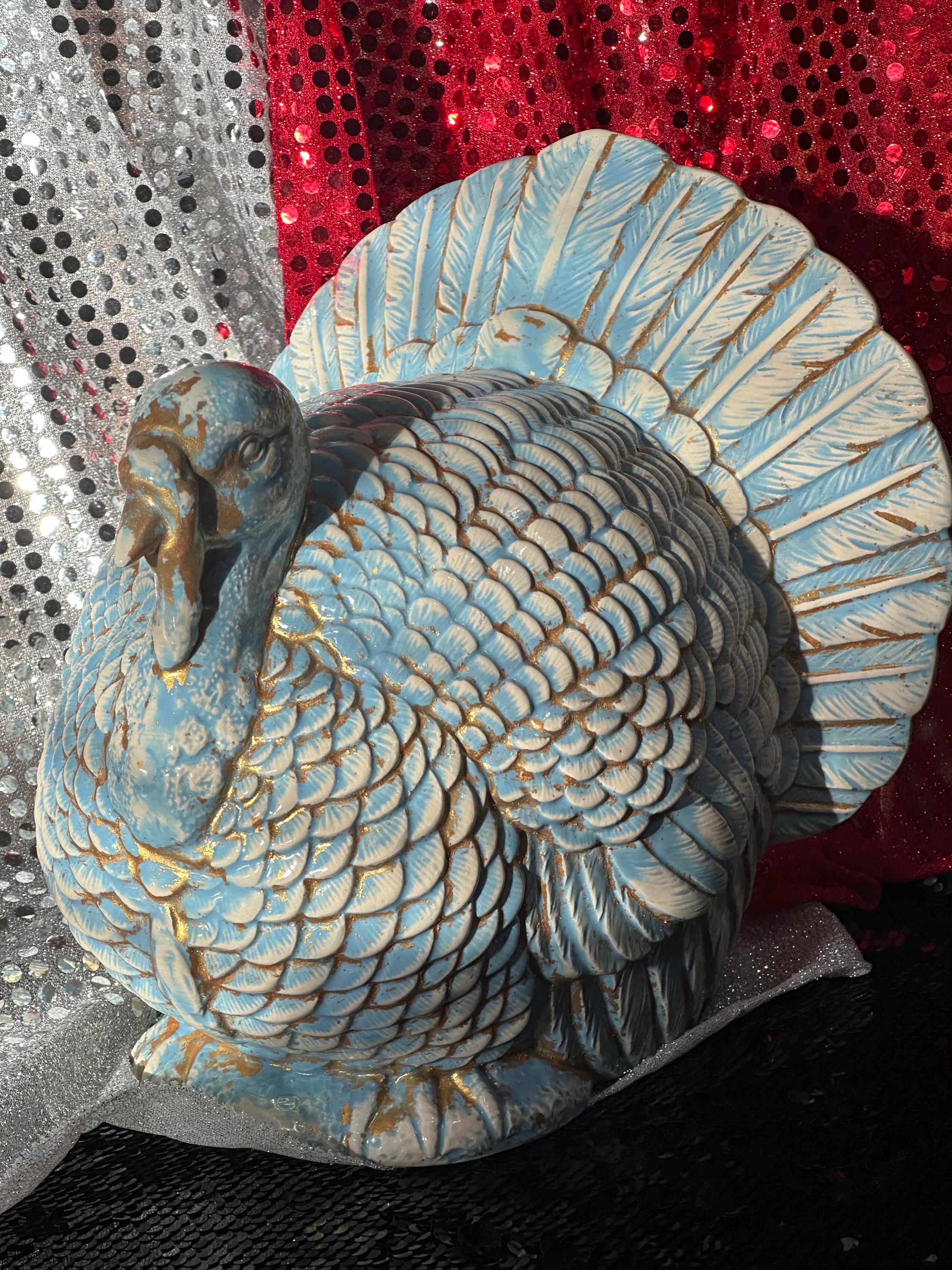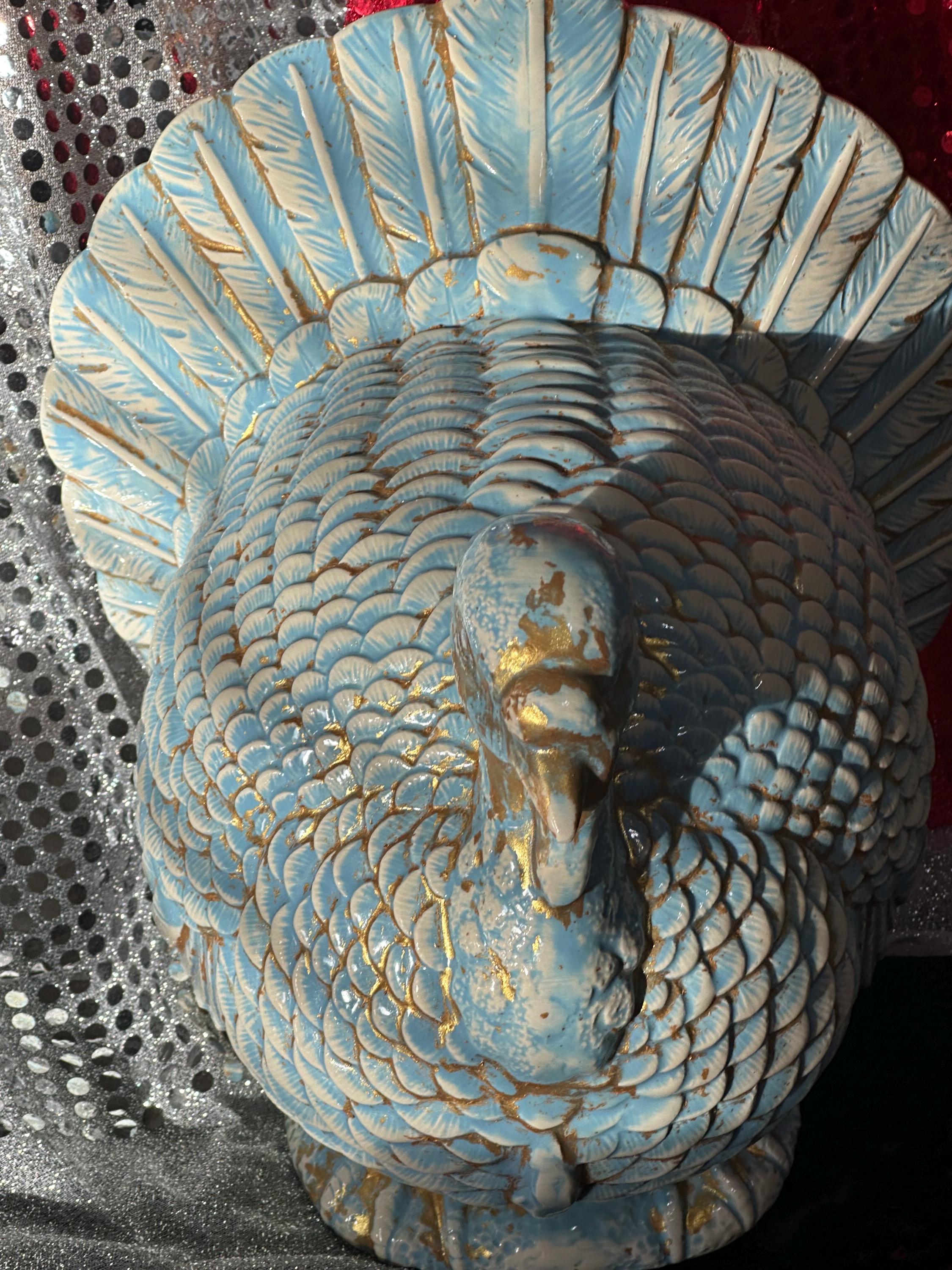 My ceramic turkey is just BEAUTIFUL. I love Turkeys and this big boy has center stage in my kitchen!! Thank you so much, the glazing is incredible, I'm considering a hen next.