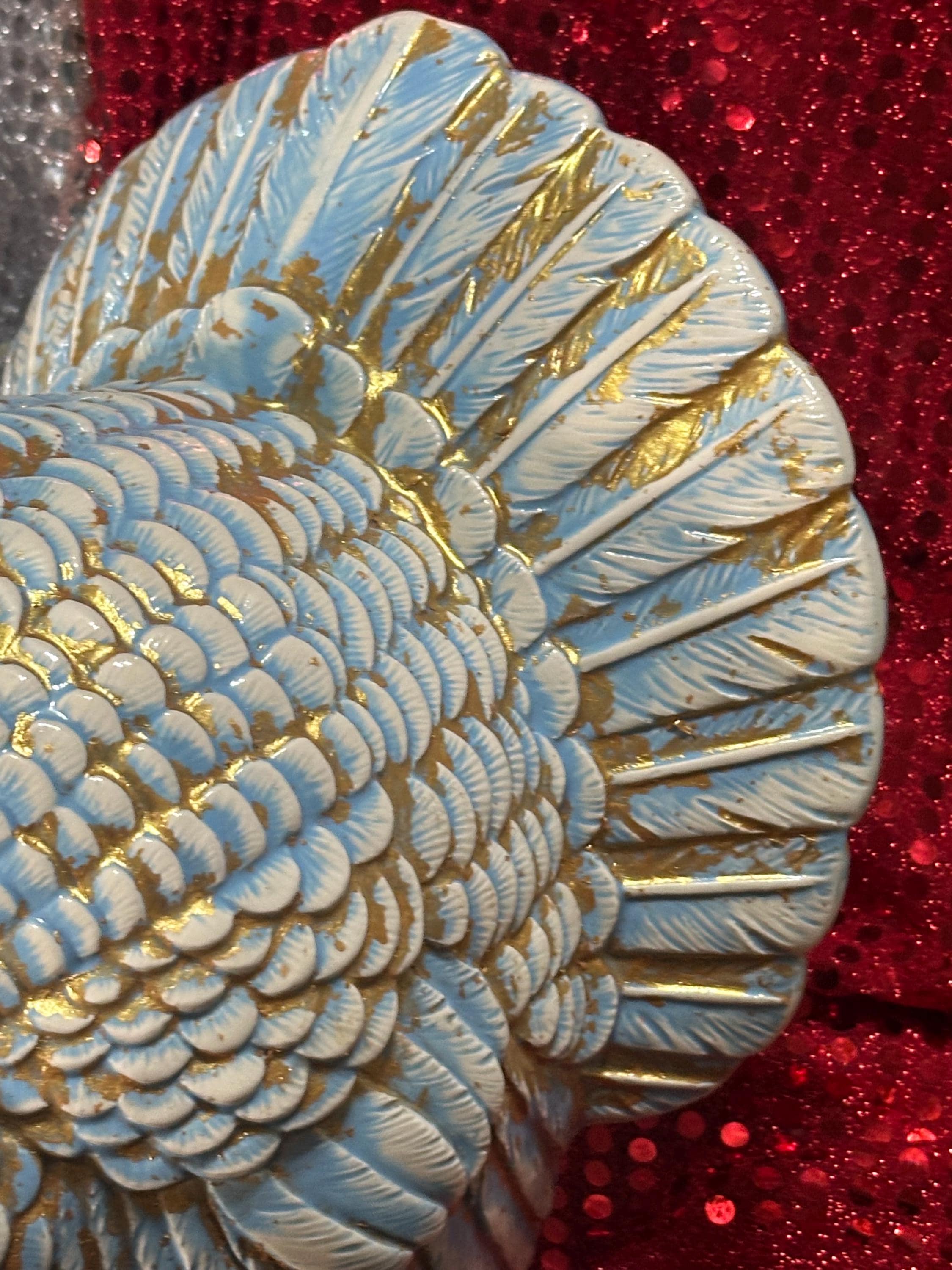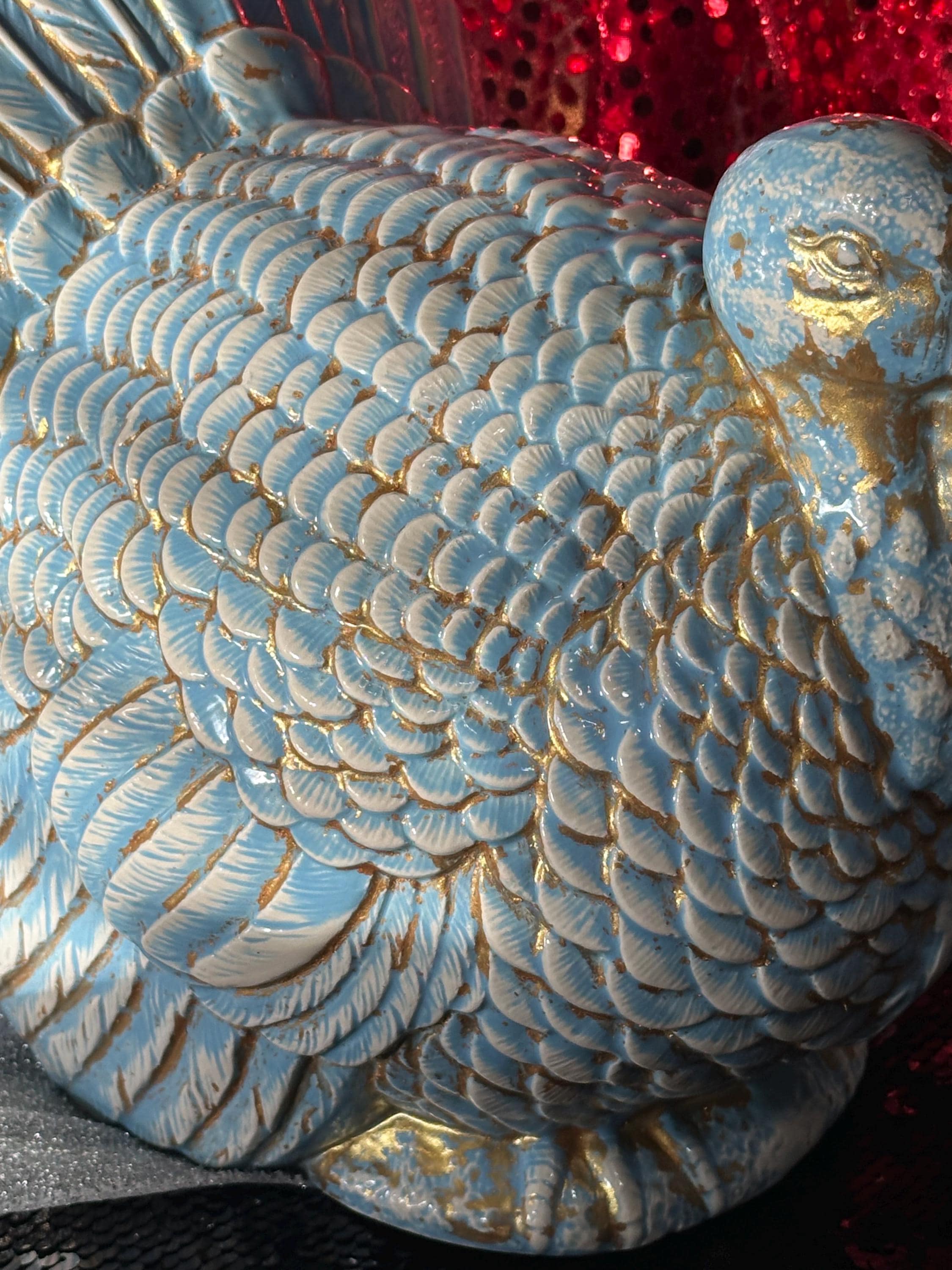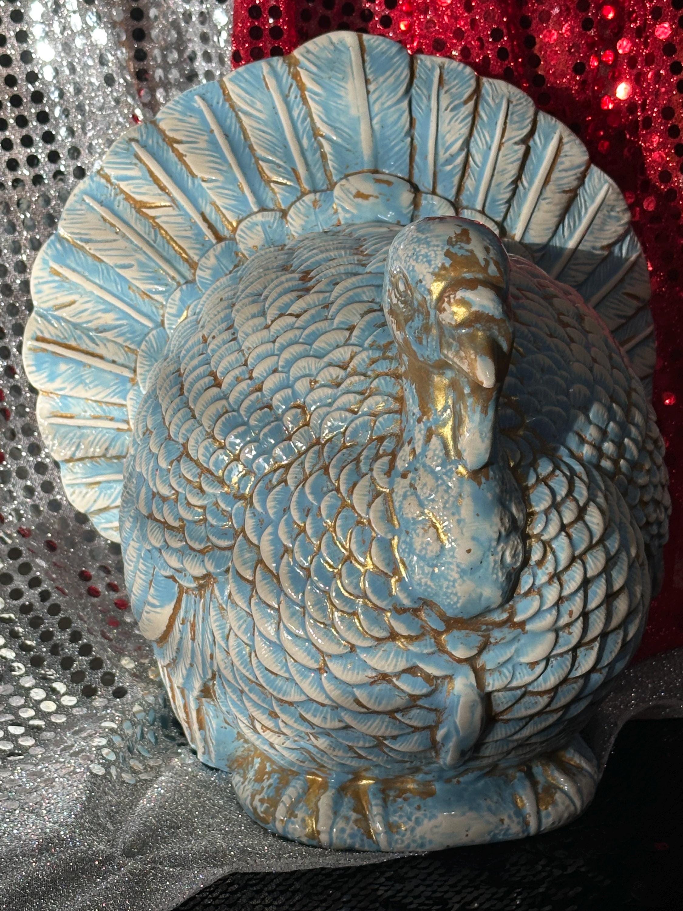 My ceramic turkey is just BEAUTIFUL. I love Turkeys and this big boy has center stage in my kitchen!! Thank you so much, the glazing is incredible, I'm considering a hen next.