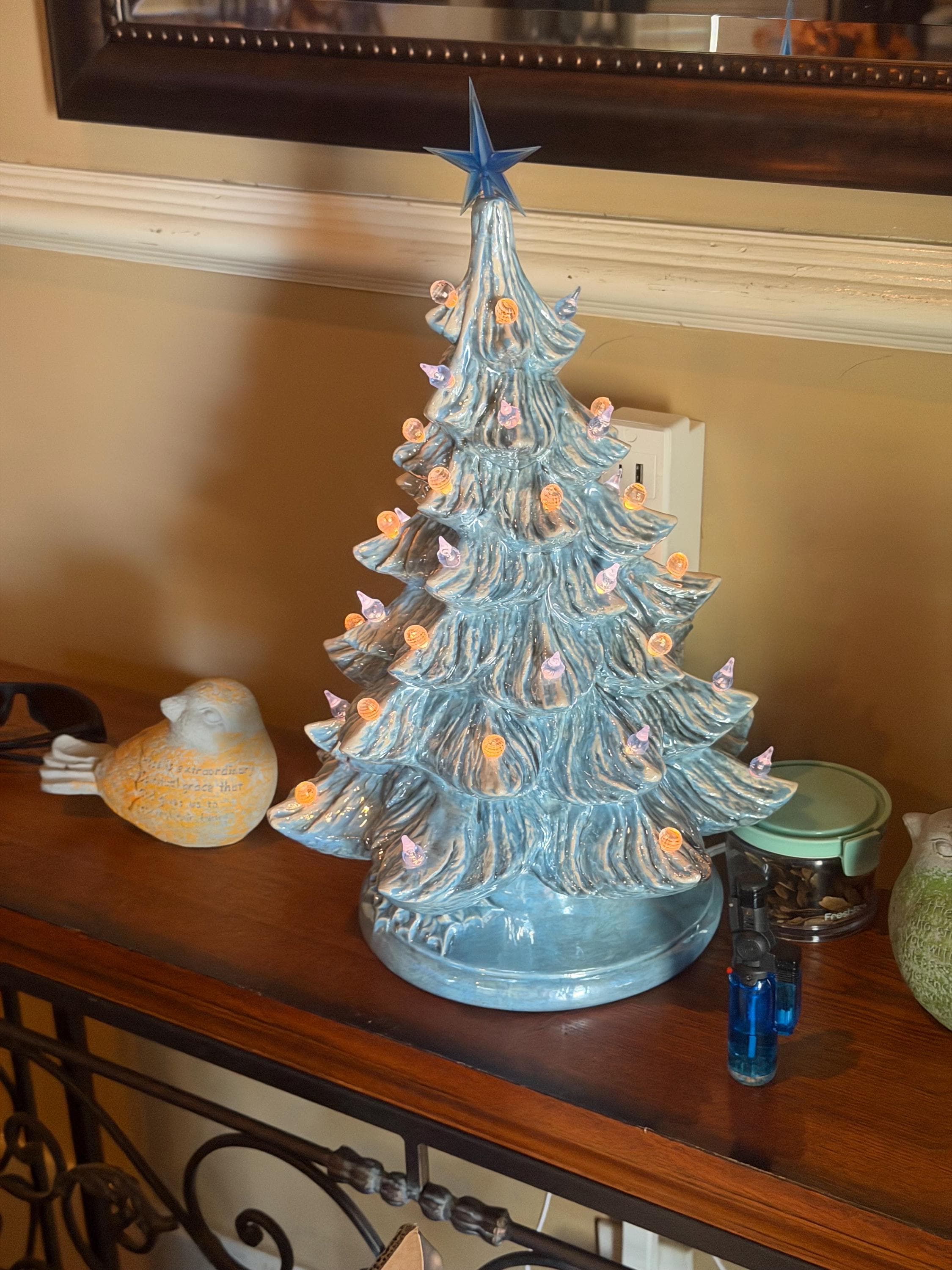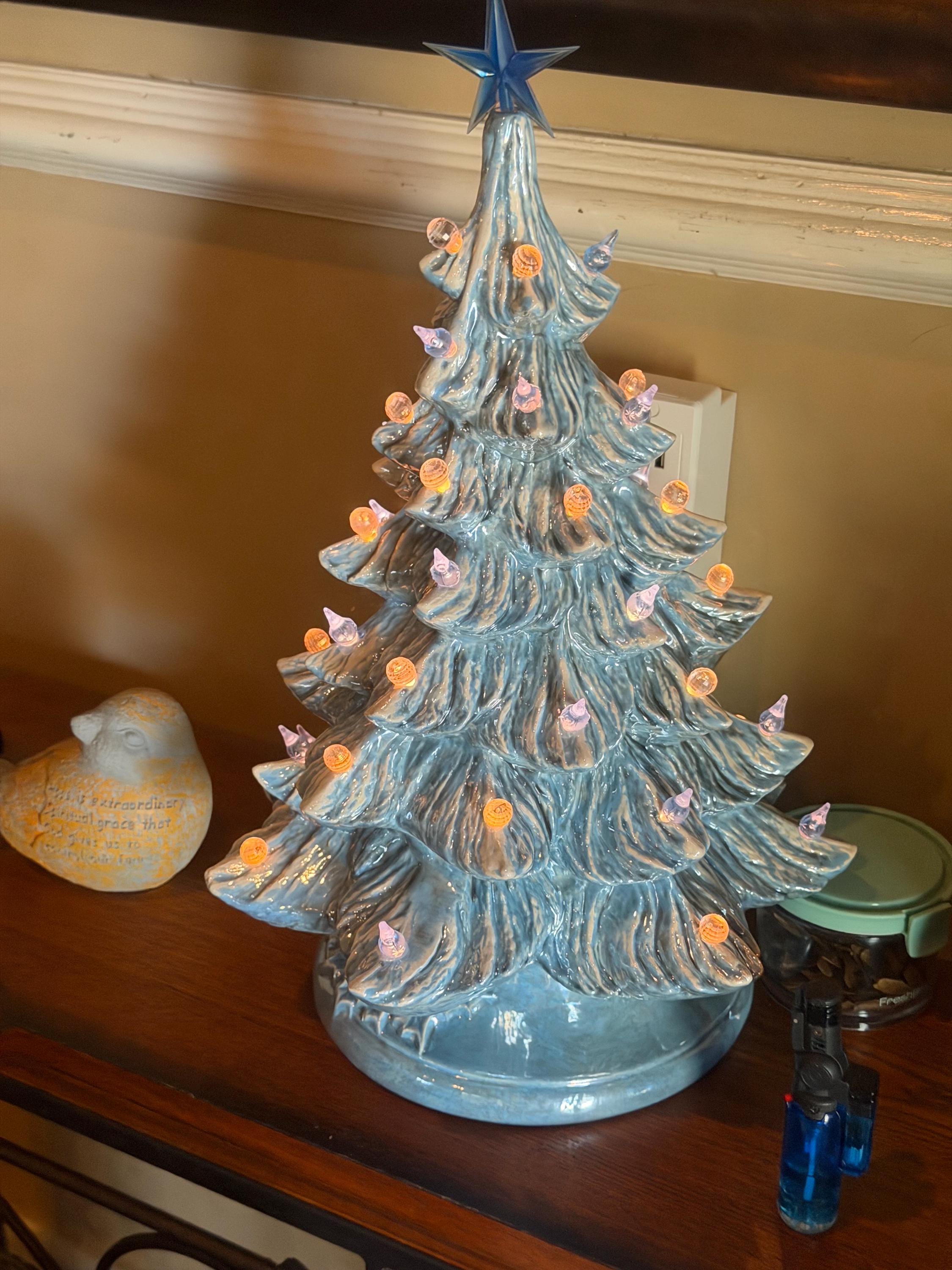comes with periwinkle twinkle bulbs, clear globes, blue and clear star