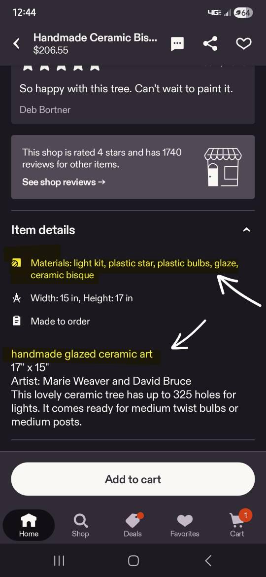 Item was falsely advertised as glazed and coming with light kit, star and bulbs. A bisque item arrived. Seller changed the item description after I complained.